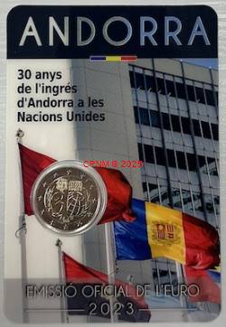 ANDORRE, 2 € commémorative 2023 "30e anniversaire de l'entrée d'Andorre aux Nations Unies", dans son coffret BU d'origine numéroté. Petit tirage : 70.000 exemplaires.
