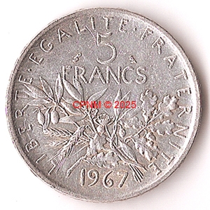 FRANCE, 5 F "Semeuse", argent, millésimée "1967", peu courante ! Seulement 702 305 exempla...