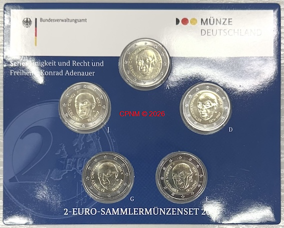 ALLEMAGNE, 2 € commémorative 2026 "Conrad Adenauer", série des 5 ateliers monétaires (A, D...
