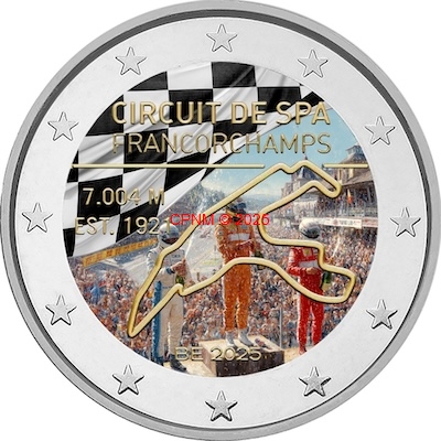 BELGIQUE, 2 € commémorative 2025 "Circuit de Spa-Foncorchamps" COLORISEE, type II (livrée ...